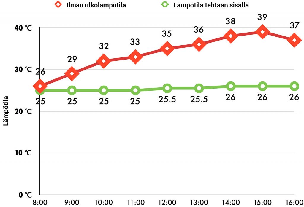 Testissä verrattiin rakennuksen ulko- ja sisälämpötilojen sekä kattopinnan sisä- ja ulkolämpötilan muutosta. Rakennukseen EI ole asennettu ilmastointia tai muuta jäähdytyslaitetta.